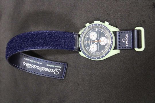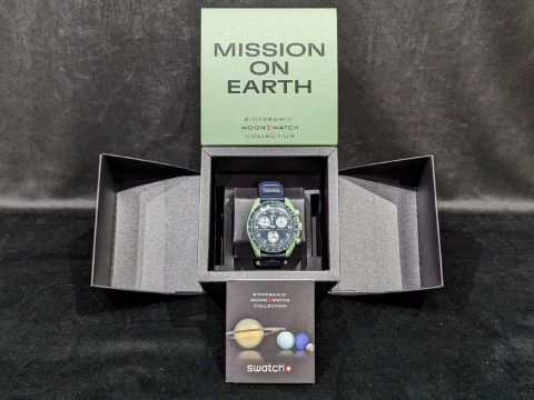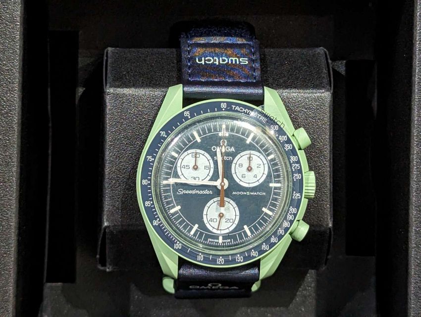 In earthy green with navy blue VELCRO© strap. All dials carry the OMEGA X SWATCH branding, as well as the iconic Speedmaster logo and the new MoonSwatch logo