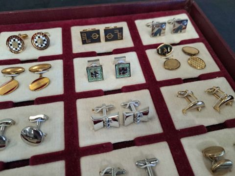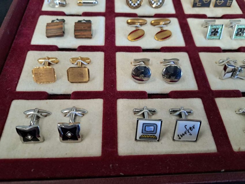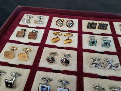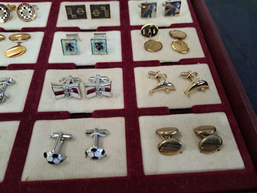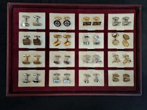 An interesting selection of 16 pairs of mixed cufflinks including 9ct gold and Jaguar cars in presentation case