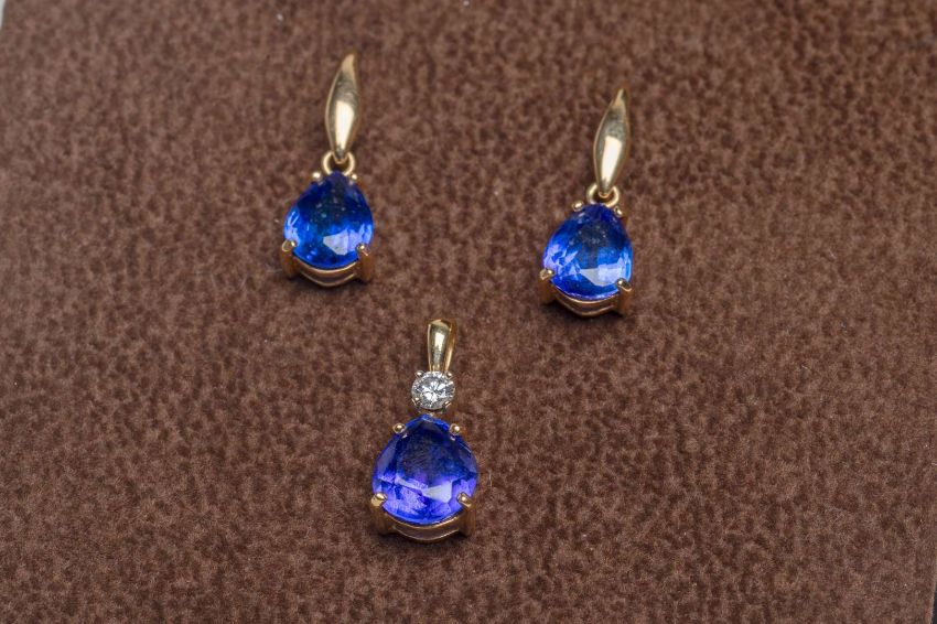 The tanzanite earrings and pendant set (possibly colour enhanced) with gold fittings. (3)