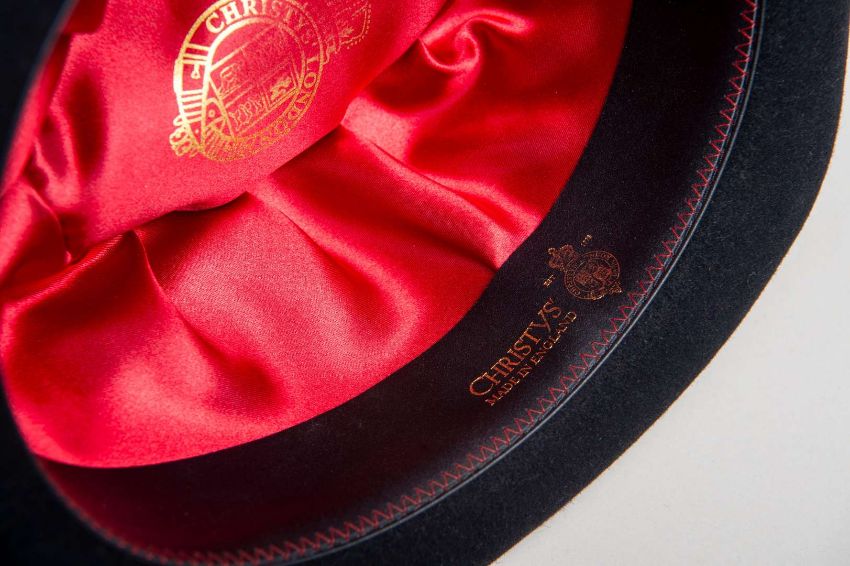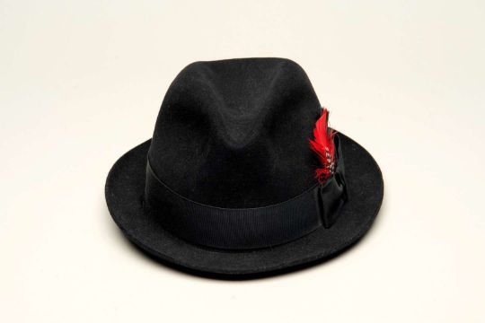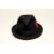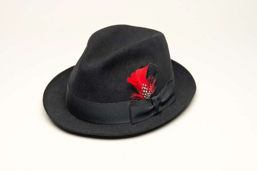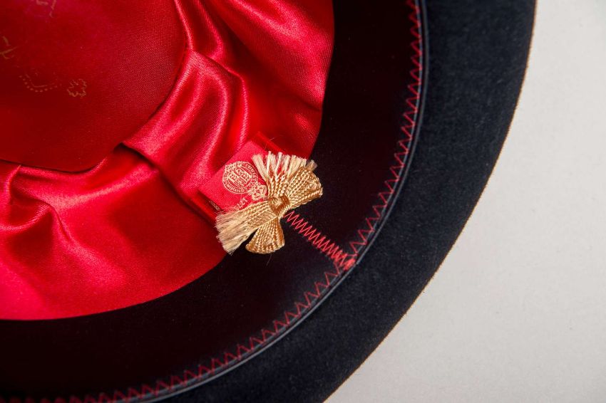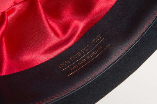 With stitched leather liner and black fabric band and with feather detail.