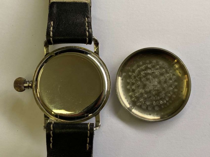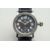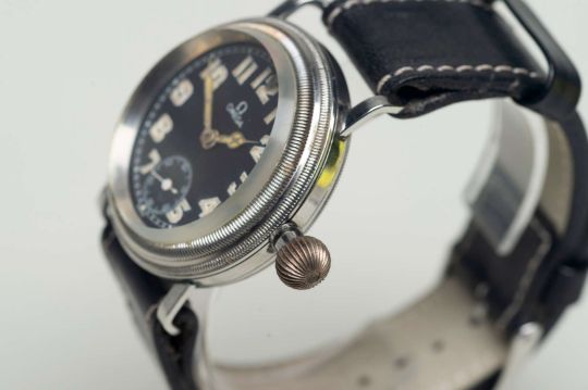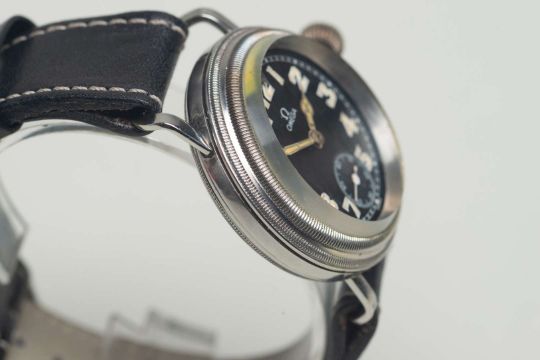 The signed and jeweled movement, 6182621, with Geneva stripe decoration, to a signed, circular black matte Arabic dial (possibly later) with outside minute track, sunk subsidiary seconds and lume filled, skeletonised hands in a polished, oversize circular case with double stepped and knurled rotating bezel and internal point marker, large winding crown, strap work lugs and a snap on cuvette and screw down back and knurled edge, 9830600. Fitted with a black leather strap with contrast stitching.