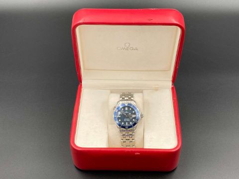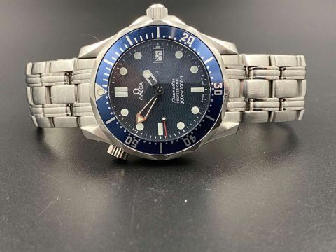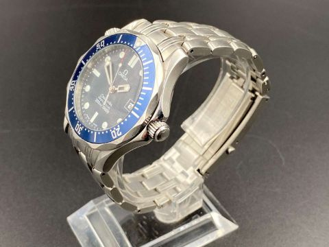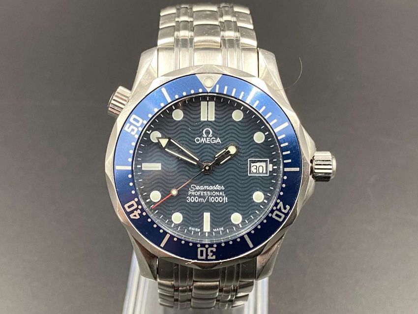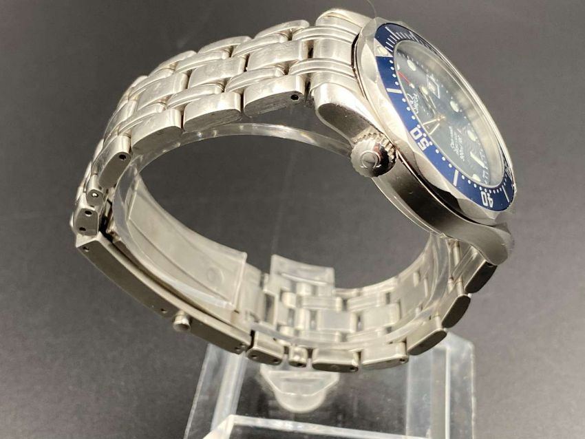 the quartz movement (unseen) to a signed blue dial with wave detail, lume markers, hands with sweep centre seconds and date aperture at 3, in a brushed and polished stainless steel case, with shouldered winding crown and further crown at 10 and signed screw down back and crowns, fitted with a brick link bracelet with deployant clasp.