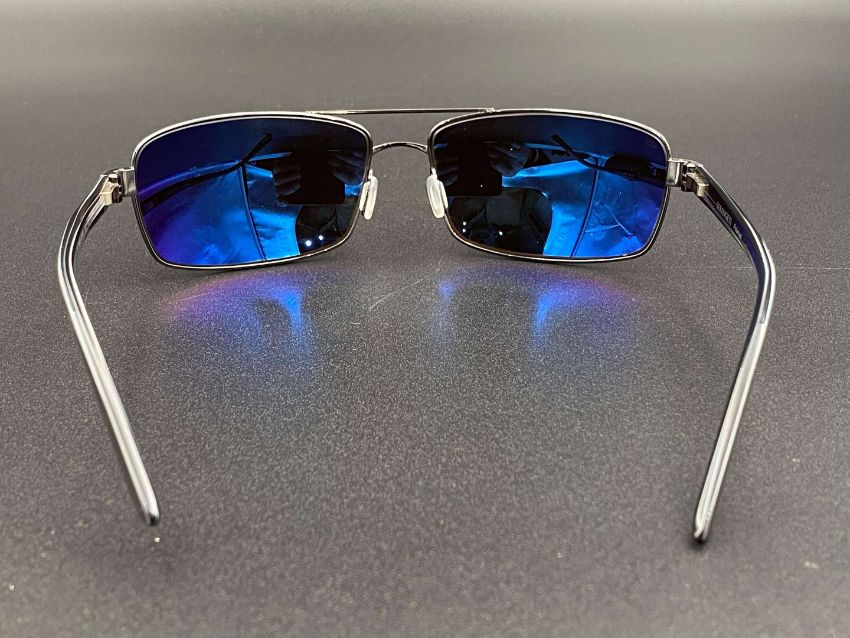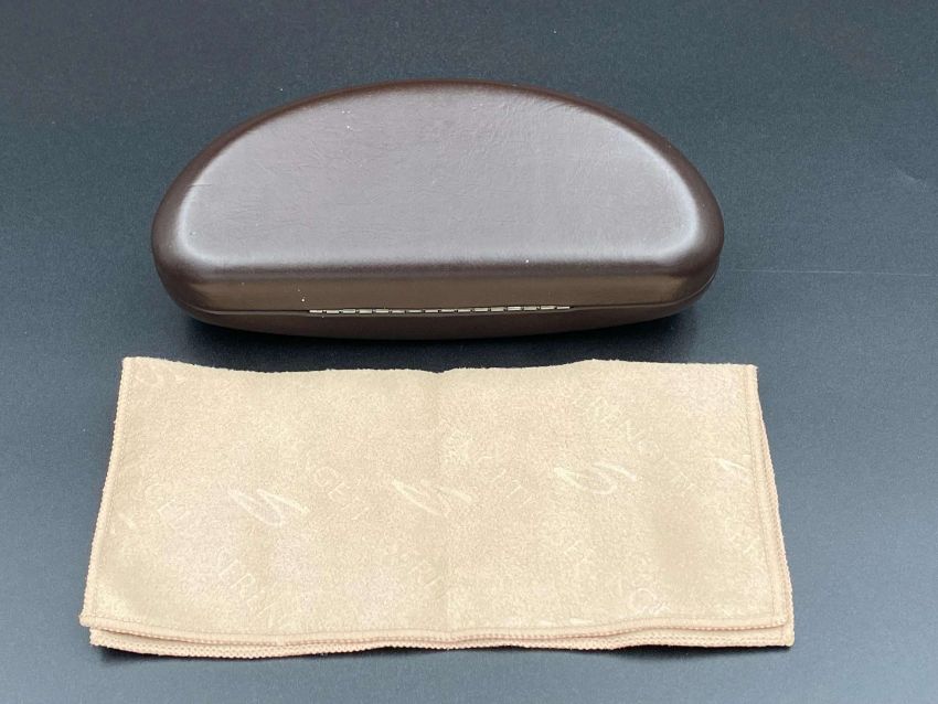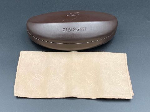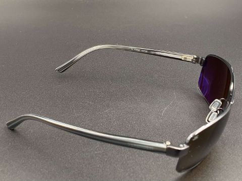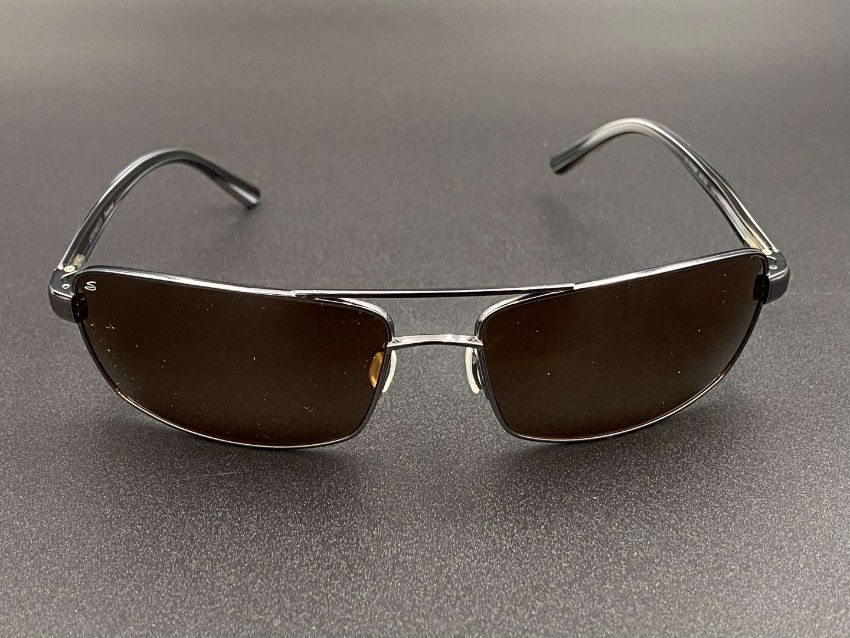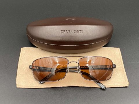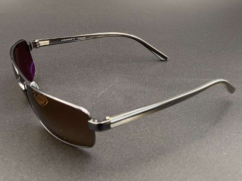 the polished alloy frames with grey stripe arms, fitted with brown polarized lenses, together with a branded cleaning cloth and hinged case.